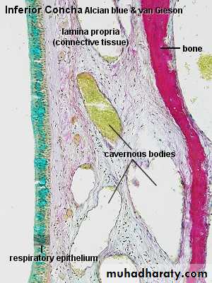 The epithelial stroma of the middle turbinate contains many glands. The large, tortuous, valveless, anastomosing veins, called sinusoids, are found mainly in the middle and inferior turbinates. By the degree of fluid contained in the sinusoids, they can influence the size of the nasal airway and, in effect, are capacitance structures. They respond to neural, mechanical, thermal, physiologic, and chemical stimuli.