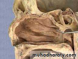The three scroll-like, pitted turbinate bones, on each side of the nose divide the nasal lumen into meatus. The space between the inferior turbinate and floor of the nose is the inferior meatus, the space between the inferior and middle turbinates is the middle meatus, and the space above the middle turbinate is the superior meatus. Occasionally, there is a supreme turbinate.21