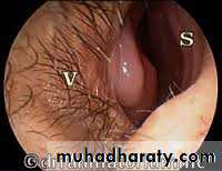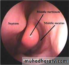 Middle Meatus This meatus lies between the middle and inferior turbinates. It contains the orifices of the frontal and maxillary sinuses and also the anterior ethmoid cells. Hidden by the anterior half of the overhanging middle turbinate is a deep crescentic groove, the infundibulum. The crescent-shaped opening is called the hiatus semilunaris. The inferior medial wall of the infundibulum forms a shelf-like ledge known as the uncinate process and above the ledge a hemispheric prominence termed the ethmoid bulla.27