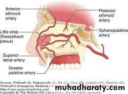 The arterial supply of the medial and lateral walls of the nasal cavity is from five sources:1. Anterior ethmoidal artery (from the ophthalmic