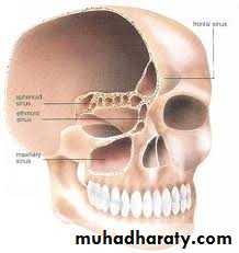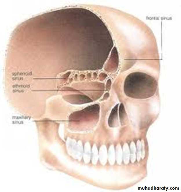 The paranasal sinuses are air-filled extensions of the respiratory part of the nasal cavity into the following cranial bones: frontal, ethmoid, sphenoid, and maxilla. They are named according to the bones in which they are located. The sinuses continue to invade the surrounding bone, and marked extensions are common in the crania of older individuals.40