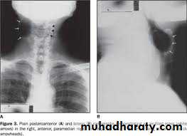 Laryngoscopy demonstrates a smooth swelling of the affected supraglottis; external laryngoceles are also palpable as a smooth, relatively soft anterior triangle mass. CT imaging demonstrates the characteristic finding of air within the lesion, which may be partially fluid filled.37