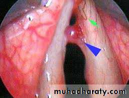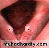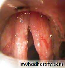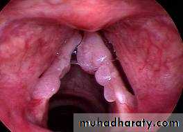 Laryngoscopy clearly shows the presence of small, well-defined vocal cord lesions. These lesions are distinguishable from the normal vocal fold by their whitish hue and are most commonly found at the junction of the anterior third and posterior two thirds of the vocal fold. They are bilateral, though often asymmetric.