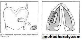 Injection of Teflon (available on a named-patient basis as it may cause granulation tissue formation) or a collagenase-resistant collagen (e.g. GAX collagen), which is injected just lateral to the vocalis muscle at two sites: just anterior to the vocal process and midway between this and the anterior commissure.• An anterior, external thyroplasty (e.g. Isshiki), posterior thyroplasty (e.g. Woodman’s operation) or a suture technique (e.g. Downie’s arytenoidoplasty).