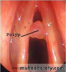 Polyps are pedunculated, unilateral lesions that are morphologically similar to the laryngeal epithelium. They often occur on the true vocal folds and may have noticeable vascular markings. They generally occur at the point of maximal vibration, the middle of the true junction of the anterior and middle thirds of the vocal fold.22