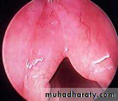 A laryngoscopy which reveals thickened, red, oedematous vocal cords.
