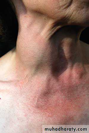 Spread beyond the larynx to involve tongue, trachea, pyriform sinus, oesophagus, thyroid etc.