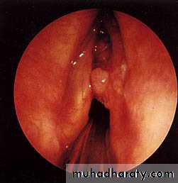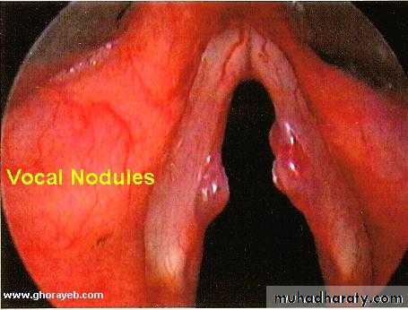 The most common laryngeal mass.Aetiology is not well understood but it may be due to: * * Vocal abuse