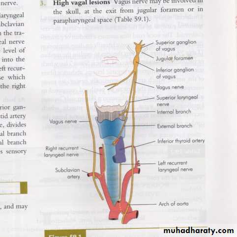 The recurrent laryngeal nerve is the motor nerve to all the laryngeal muscles except the cricothyroid muscles which is supplied by the external branch of the superior laryngeal nerve.The cricothyroid muscle has an adductor effect on the vocal cords, and thus a lesion which spares the superior laryngeal nerve will leave the cord lying nearer the midline than one which paralyses both the recurrent and superior laryngeal nerves.
