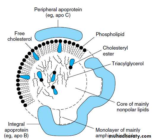 Lipoproteins consist of a nonpolar core & a single surface layer of amphipathic lipids. The nonpolar lipid core consists of mainly triacylglycerol and cholesteryl ester and is surrounded by a single surface layer of amphipathic phospholipid and cholesterol molecules.These are oriented so that their polar groups face outward to the aqueous medium, as in the cell membrane. The protein moiety of a lipoprotein is known as an apolipoprotein or apoprotein, constituting nearly 70% of some HDL and as little as 1% of chylomicrons. Some apolipoproteins are integral and cannot be removed, whereas others are free to transfer to other lipoproteins.There are four major groups of plasma lipoproteins: