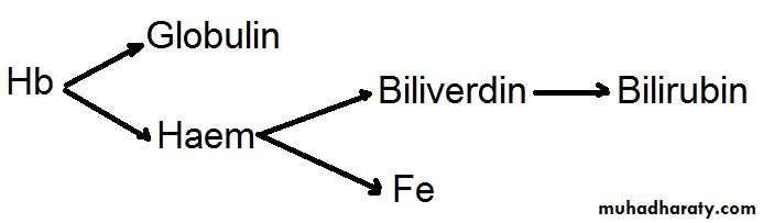 The released Hb is split into globin, which enters the general protein pool, and haem, which is converted to bilirubin after removal of iron. The iron is reutilised, 80% of bilirubin is metabolised daily by this process.