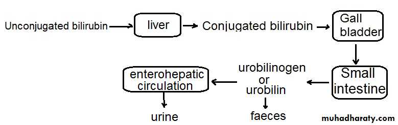 The conjugated or direct bilirubin is water soluble. Normally, about 300 mg of bilirubin reaches the liver and is conjugated daily.Conjugated bilirubin is secreted into bile canaliculus and further to gall bladder for storage, concentration and excretion into small intestine. In the intestine, bacteria deconjugate the bilirubin glucuronate and reduce bilirubin to urobilinogen. Most of this urobilinogen is excreted in the faeces as such or as urobilin after oxidation in air. A small portion is reabsorbed through the enterohepatic circulation to be excreted in the urine. Therefore, normal urine contains urobilinogen but not bilirubin. However, the disappearance of urobilinogen and appearance of bilirubin (direct) in the urine is an abnormal condition that indicate the presence of obstructive jaundice. P.235
