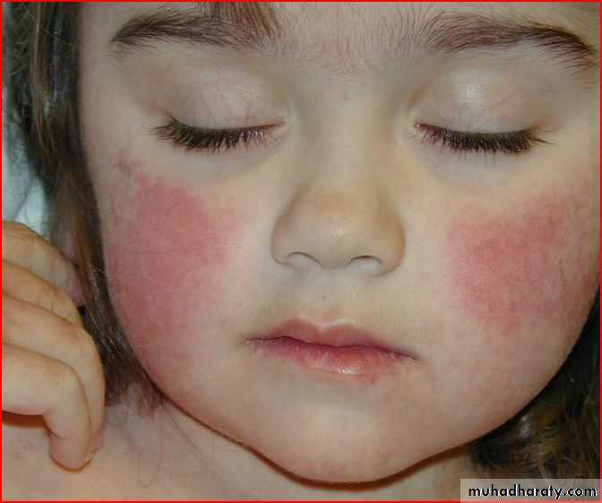 Erythematous cheeks, appearing as a "slapped cheek" rash.