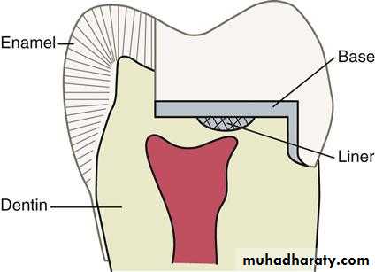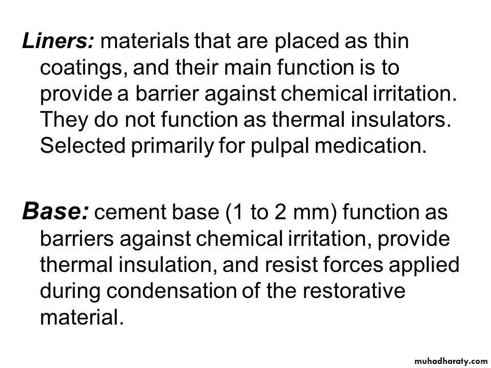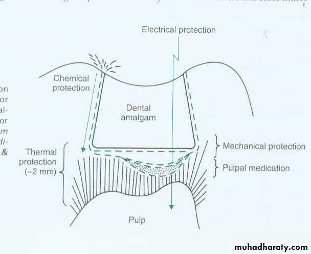 • Acts as a thin barrier between the restoration and the remaining dentine and protects the pulpal tissue from irritation caused by physical,mechanical,biological, or chemical agents .• Like cavity varnish it neither possesses mechanical properties nor provides thermal insulation.