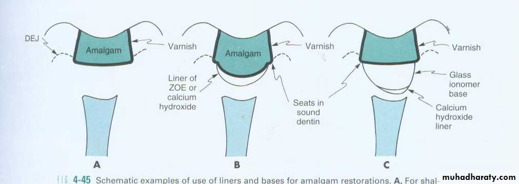 In a moderately deep tooth excavation for amalgam that includes some extension of the preparation toward the pulp so that a region includes less – than – ideal dentin protection, it may be judicious to apply a liner only at that site using ZOE or calcium hydroxide.