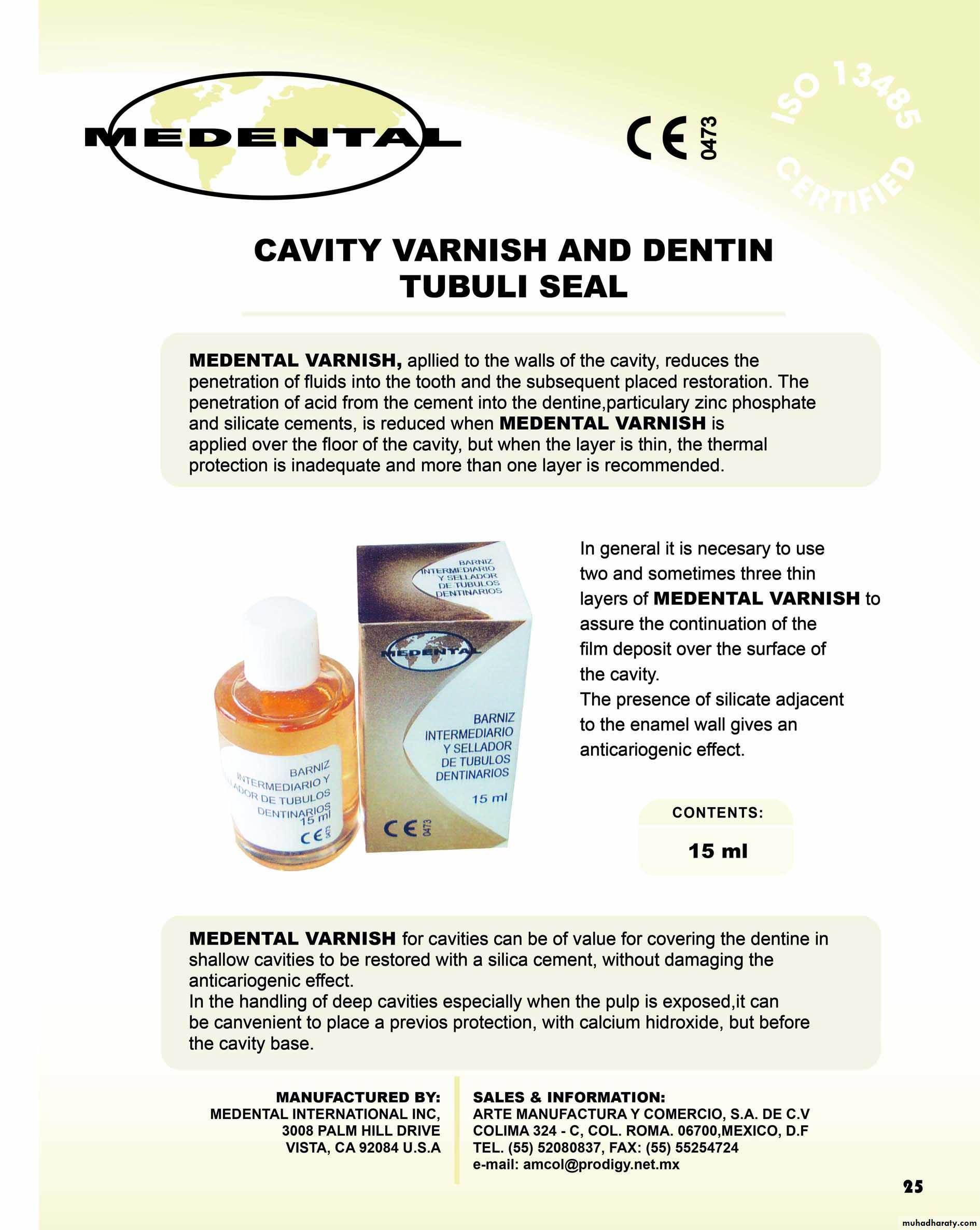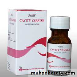 On a patient, Cavity varnish is applied with the help of small cotton pellet with the help of wire or R.C. Reamer or a brush applicator. Thin layers of varnish are applied on the floor, walls including cavosurface margins. Gentle stream of air can be used to remove the excess.Apply a second coat and the bottle should be tightly capped after use to minimize loss of solvent.Contraindication: