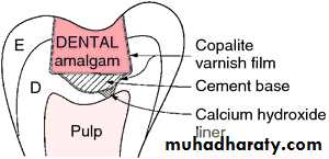 Clinical Judgements about the need for specific liners and bases are linked to the amount of remaining dentin thickness (RDT), considerations of adhesive materials, and the type of restorative material being used.In a shallow tooth excavation, which includes 1.5 to 2mm or more of RDT, there is no need for pulpal protection other than in terms of chemical protection. For an amalgam restoration, the preparation is coated with two thin coats of a varnish, or a dentin bonding system, and then restored.