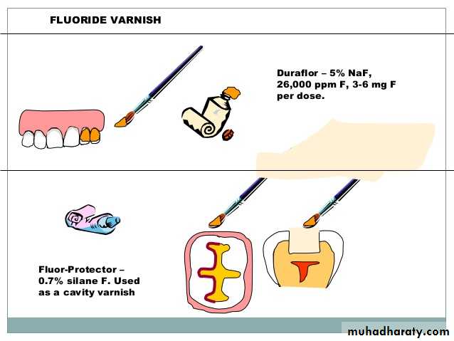 Copal and nitrated cellulose are typical examples of natural gum and the solvents used to dissolve these materials can be ether, acetone benzene, ether acetate, ethyl alcohol, chloroform, amylacetate and medicaments such as chlorobutanol, thymol and eugenol are also added. Recently fluoride are included in its composition.Flouride varnishes are used to prevent/arrest decay on smooth surfaces in young children as 2 applications/year.