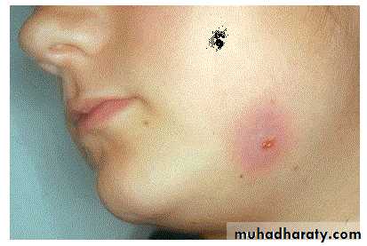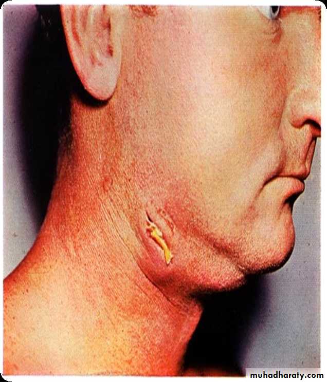 Most (70–80%) actinomycotic infections are chronic, granulomatous, endogenous infections of the orofacial region.Typically, the lesions present as a chronic abscess,commonly at the angle of the lower jaw, with multiple external sinuses. There is usually a history of trauma such as a tooth extraction or a blow to the jaw.