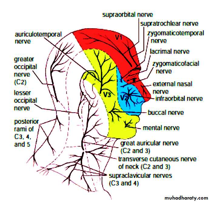 The greater occipital nerve (C2):-Back of neck & back of occipital region up to the vertex.