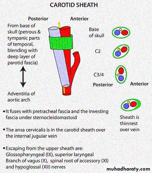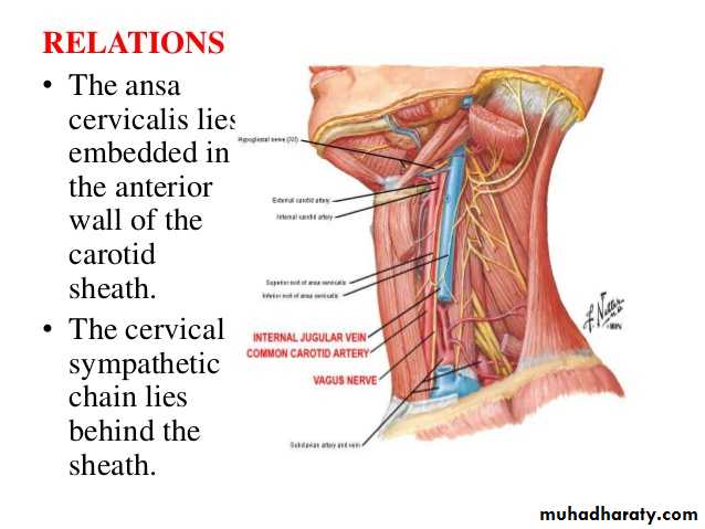Embedded within the wall of carotid sheath is the ansa cervicalis nerve while immediately behind is the sympathetic trunk.