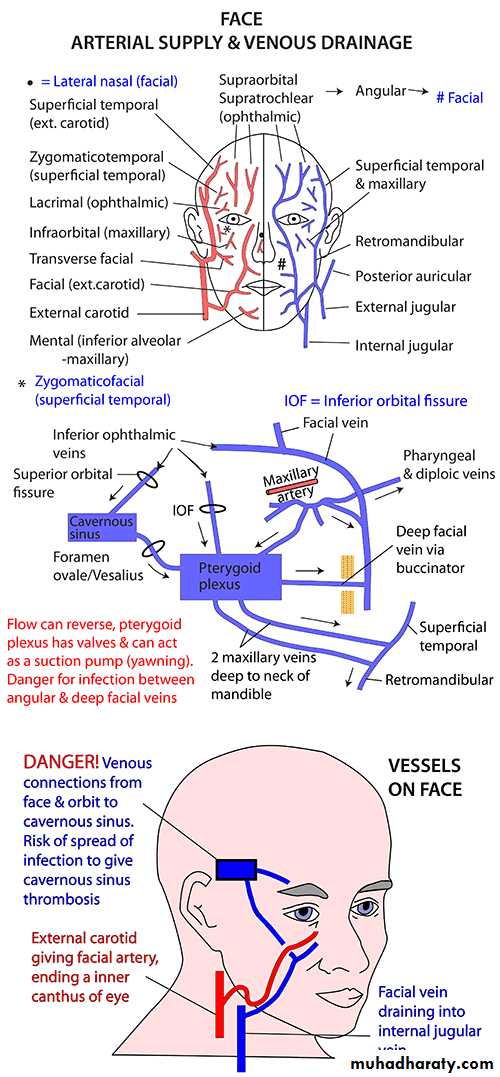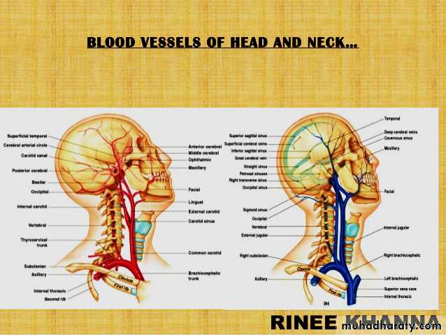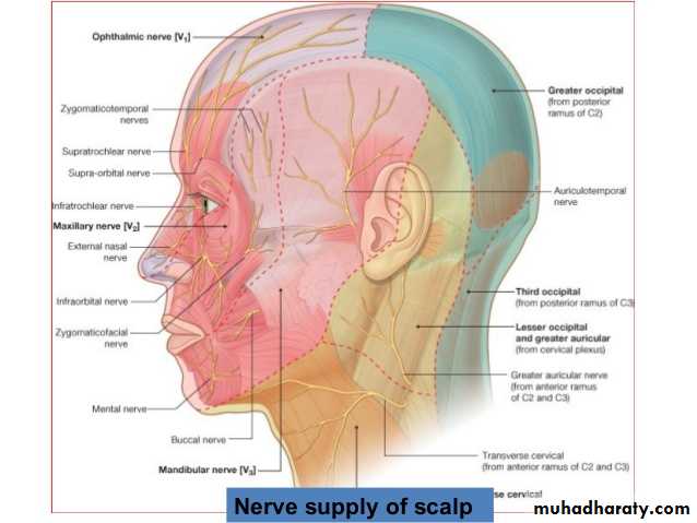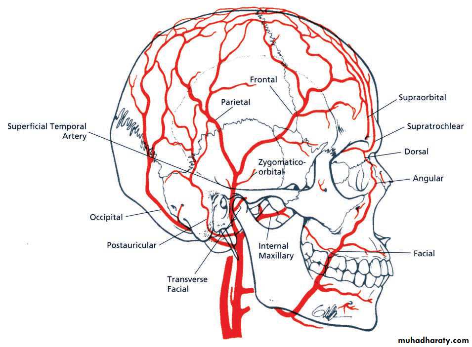 The arteries of the scalp are derived from the1- External carotid artery by the occipital, posterior auricular and superficial temporal branches.