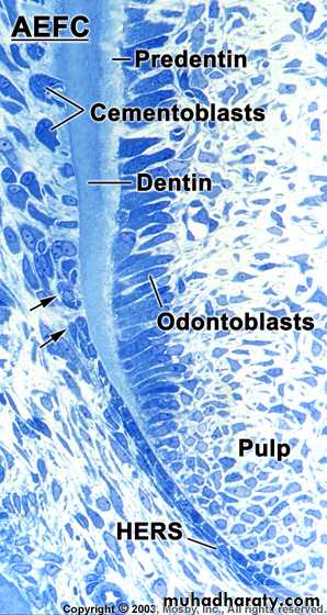 Ectomesenchymal cells from the inner portionof the dental follicle come in with predentin by