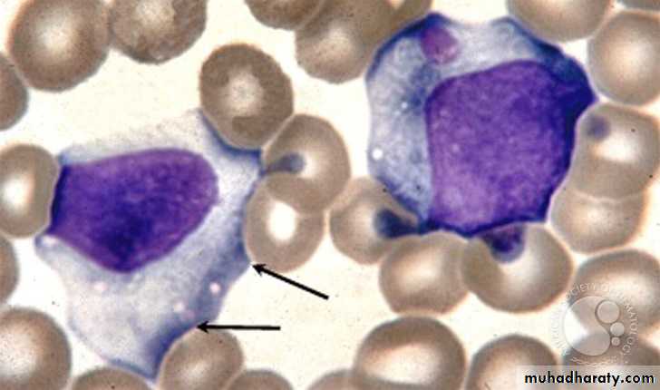 large cytoplasm,nucleoli in the nucleus, indented by surrounding RBCsAtypical lymphocytes