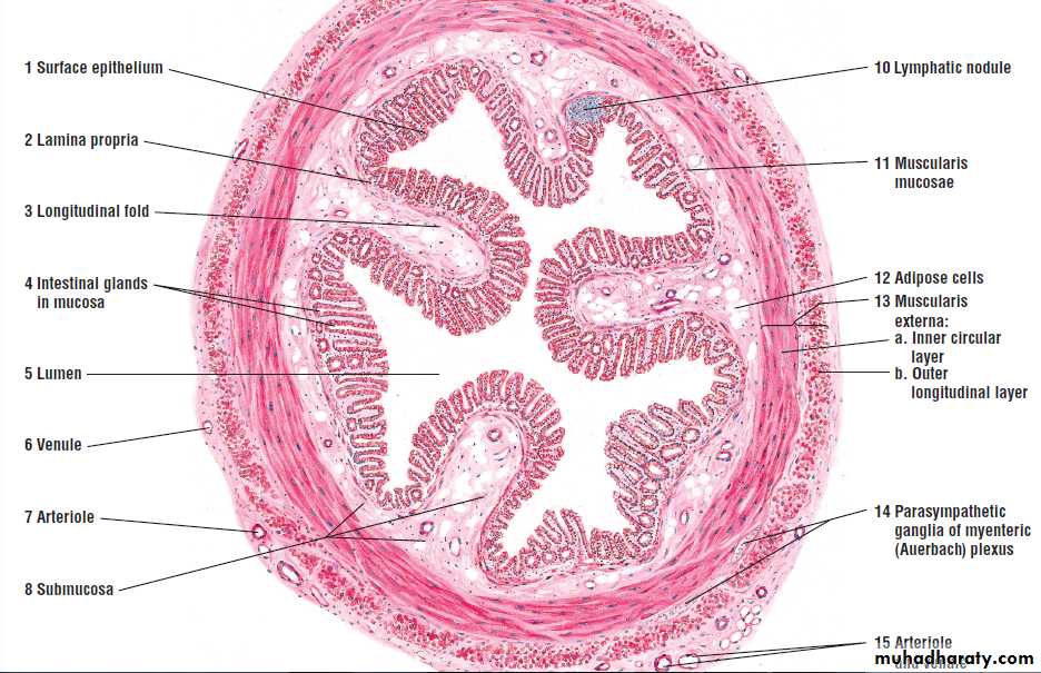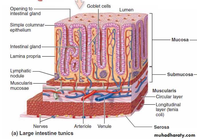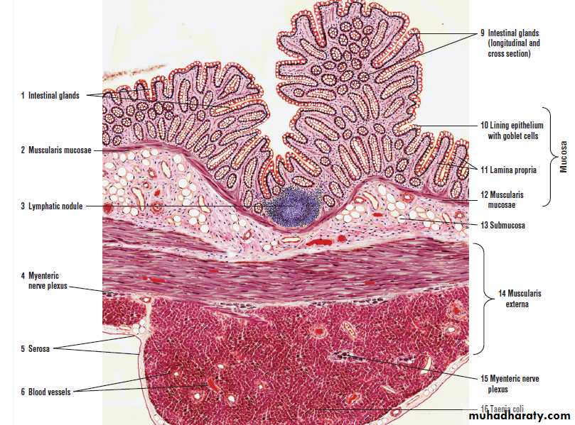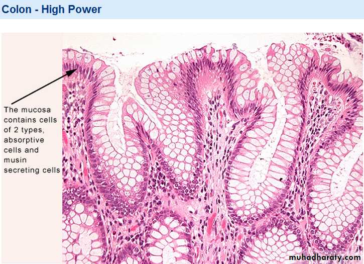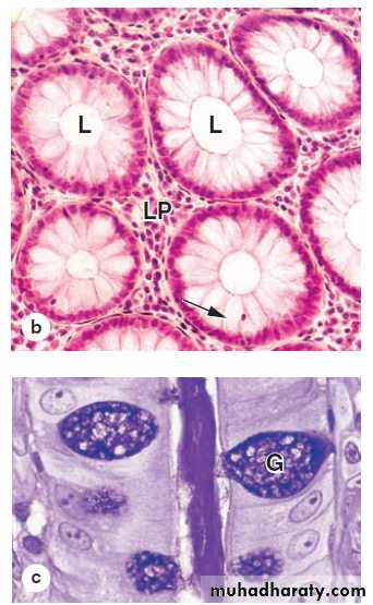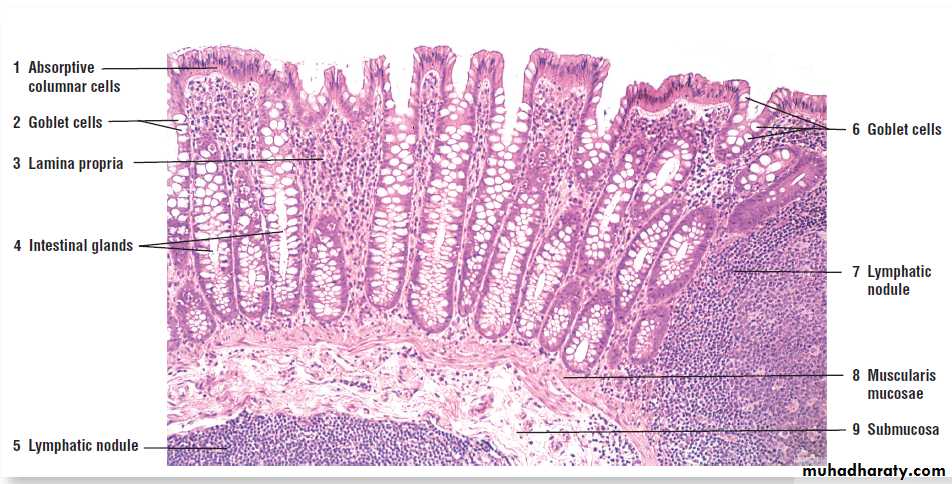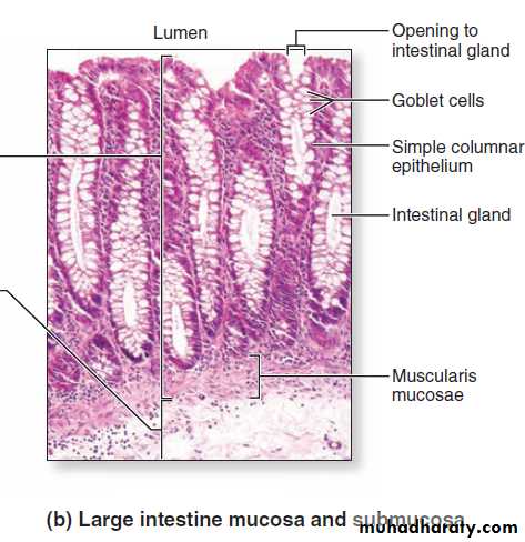 The connective tissue lamina propria contains the long intestinal glands (crypts of Lieberkühn) that continue through its lenghth to the smooth muscle layer muscularis mucosa.so they are deeper (longer) than those of the S.I. and lack the Paneth cell in their bases.Sub mucosa