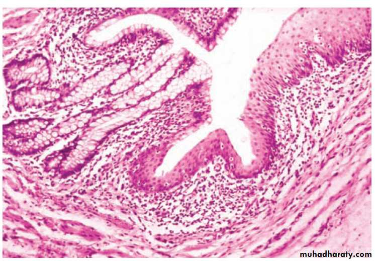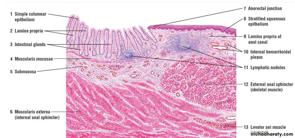 The rectal mucosa is similar to the mucosa of the colon. The intestinal glands are somewhat shorter and spaced farther apart. As a result, the lamina propria is more prominent, diffuse lymphatic tissue is more abundant, and solitary lymphatic nodules are more numerousTh e muscularis mucosae and the intestinal glands of the digestive tract terminate in the vicinity of the anorectal junction .
