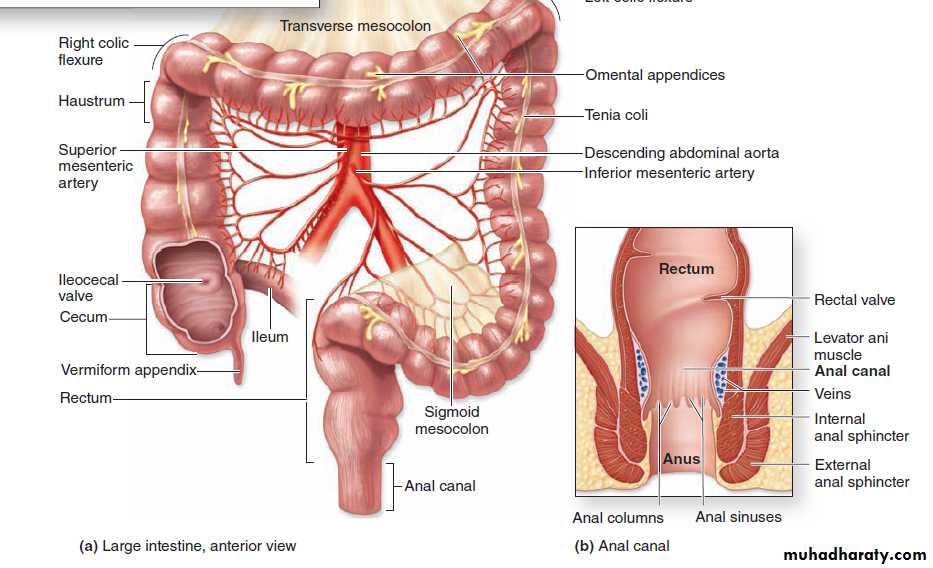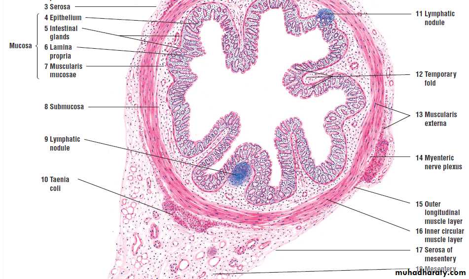 The muscularis externa has a typical inner circular layer, but the outer longitudinal muscle is only present in three equally spaced bands, the teniae coli .As in the circular layer, the taeniae coli are supplied by blood vessels, & by The parasympathetic ganglia of the myenteric nerve plexus.