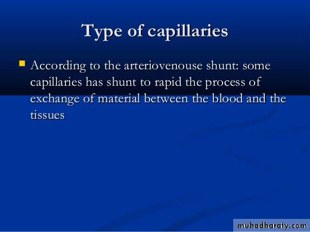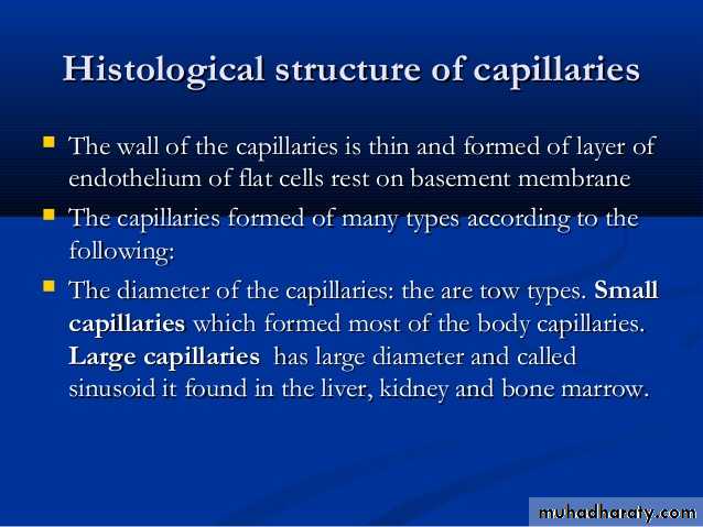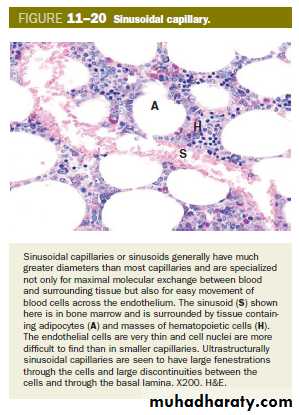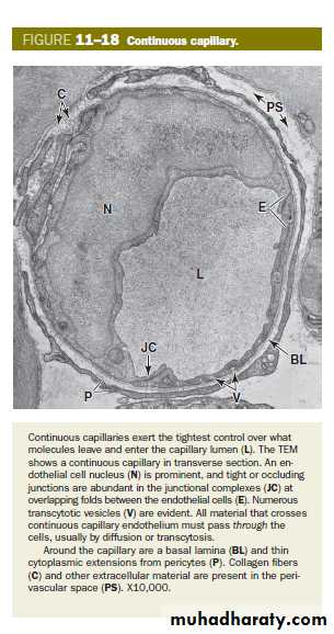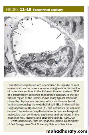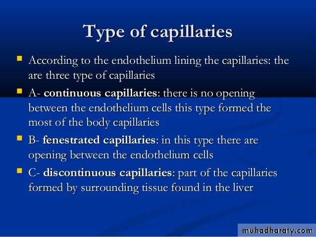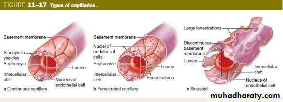 types of capillaries (a) Continuous capillaries- have tight, occluding junctions sealing the intercellular clefts between all the endothelial cells to produce minimal fluid leakage. (b) Fenestrated capillaries- also have tight junctions, but perforations (fenestrations) through the endothelial cells allow greater exchange across the endothelium. c) Sinusoids, or discontinuous capillaries, usually have a wider diameter than the other types and have discontinuities between the endothelial cells, large fenestrations through the cells, and a partial, discontinuous basement membrane.