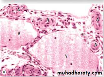 (b) Larger collecting venules (V) have much greater diameters than arterioles (A), but the wall is still very thin, consisting of an endothelium with more numerous pericytes or smooth muscle cells. X200. Toluidine blue.