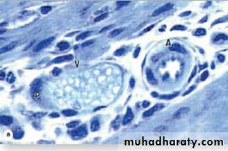 • Compared to arterioles (A), postcapillary venules (V) have large lumens and an intima of simple endothelial cells, with occasional pericytes (P). X400. Toluidine blue (TB)