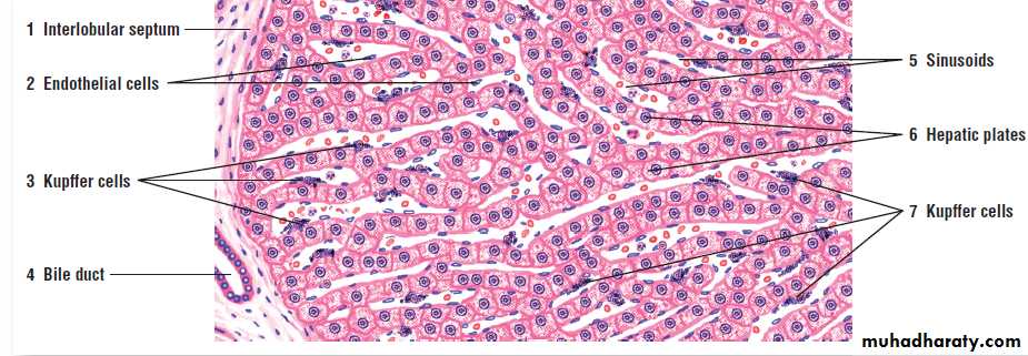 Between the hepatocyte plates are liver sinusoids, which are enlarged capillaries.