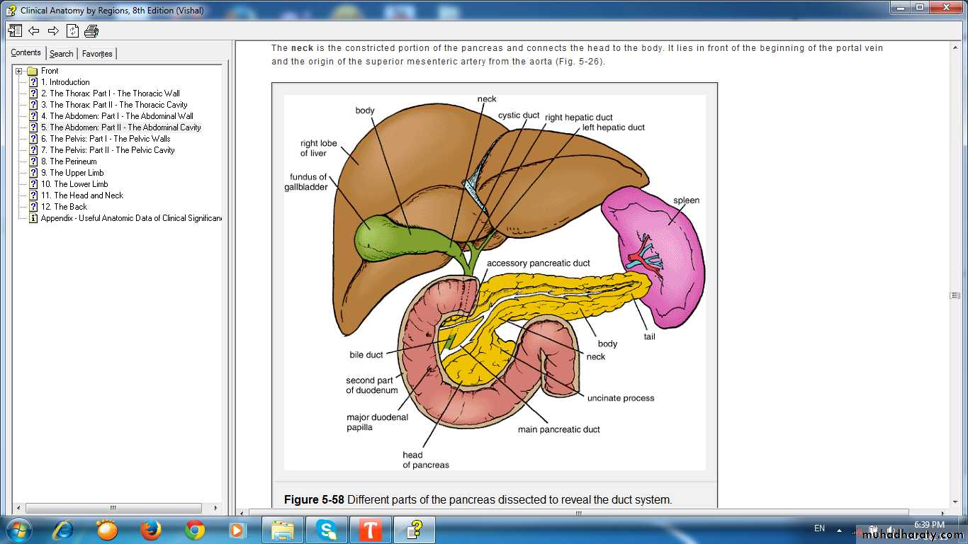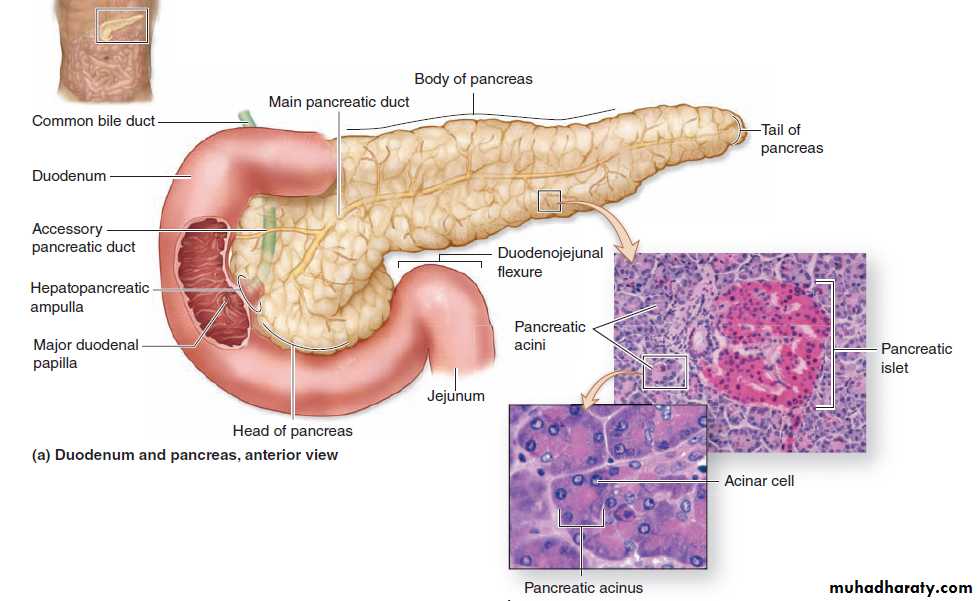 Anatomically ( head, neck, body & tail with the main pancreatic duct embeded along the gland).
