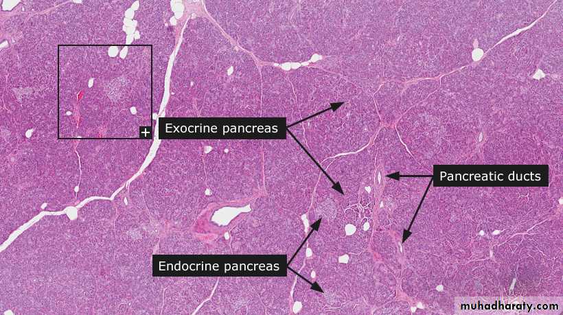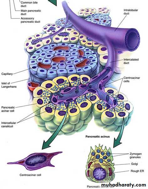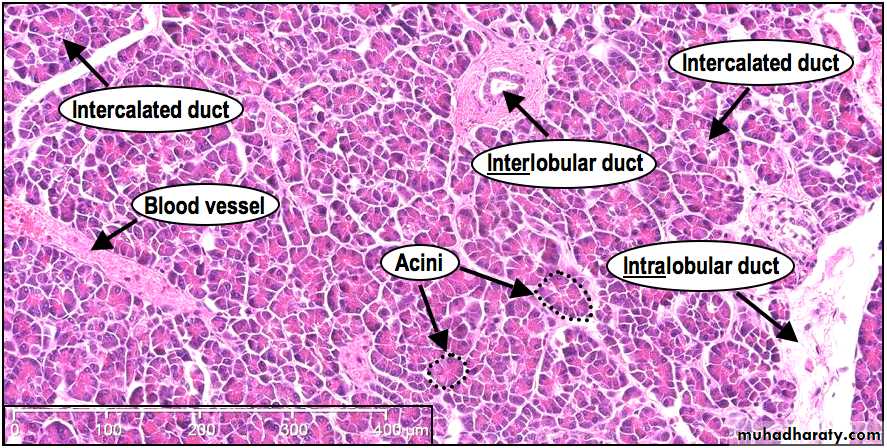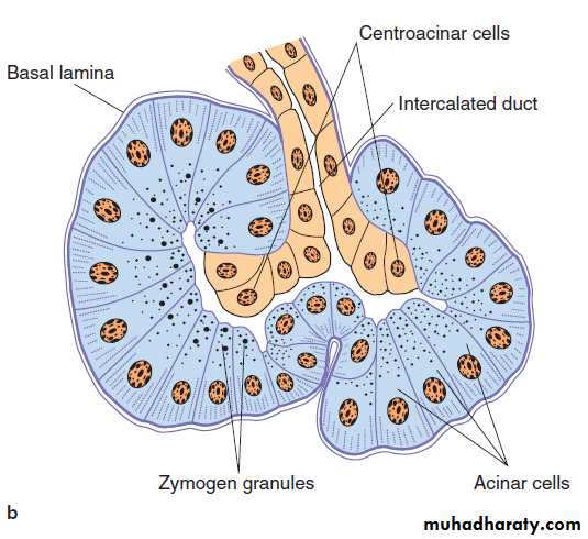 *secretory part:-The exocrine secretory units or acini contain pyramid-shaped serous acinar cells, whose apices are filled with secretory granules.