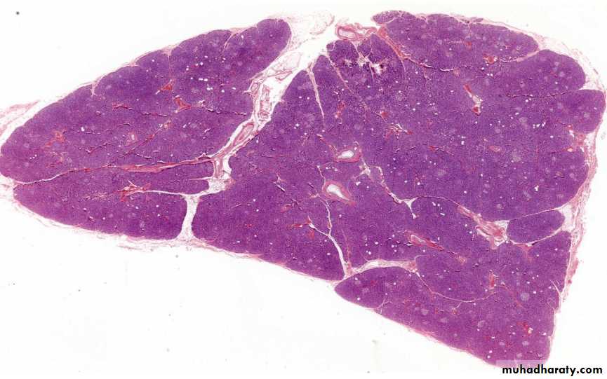 The pancreas has a thin capsule of connective tissue, from which septa extend to cover the larger vessels and ducts and to separate the parenchyma into lobulesHistologically the pancreas consists of stroma & paranchyma,