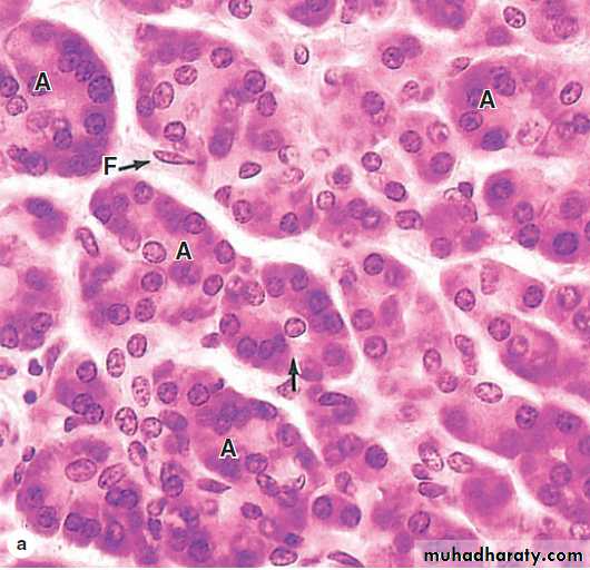 (a) Micrograph of exocrine pancreas shows the serous, enzyme-producing cells arranged in small acini (A) with very small lumens. Acini are surrounded by only small amounts of connective tissue with fibroblasts (F). Each acinus is drained