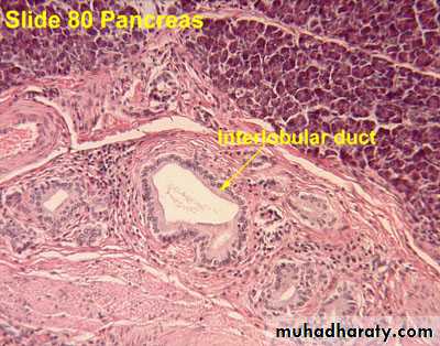 Intercalated ducts from different acini merge to form intralobular ducts in the connective tissue(simple columnar epith.), which, in turn, join to form larger interlobular ducts (simple cuboidal epithelium that becomes taller and stratified as the ducts increase in size) that empty into the main pancreatic duct.