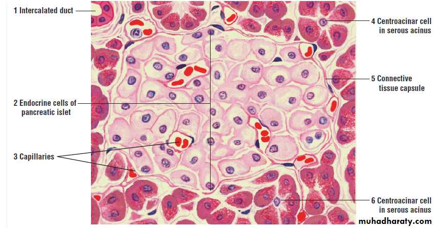 Capillaries (2) around the endocrine cells demonstrate the rich vascularity of the pancreatic islets. Th e thin connective tissue capsule (4) separates the islet cells from the serous acini (6). Centroacinar cells (5) are visible in some of the acini.