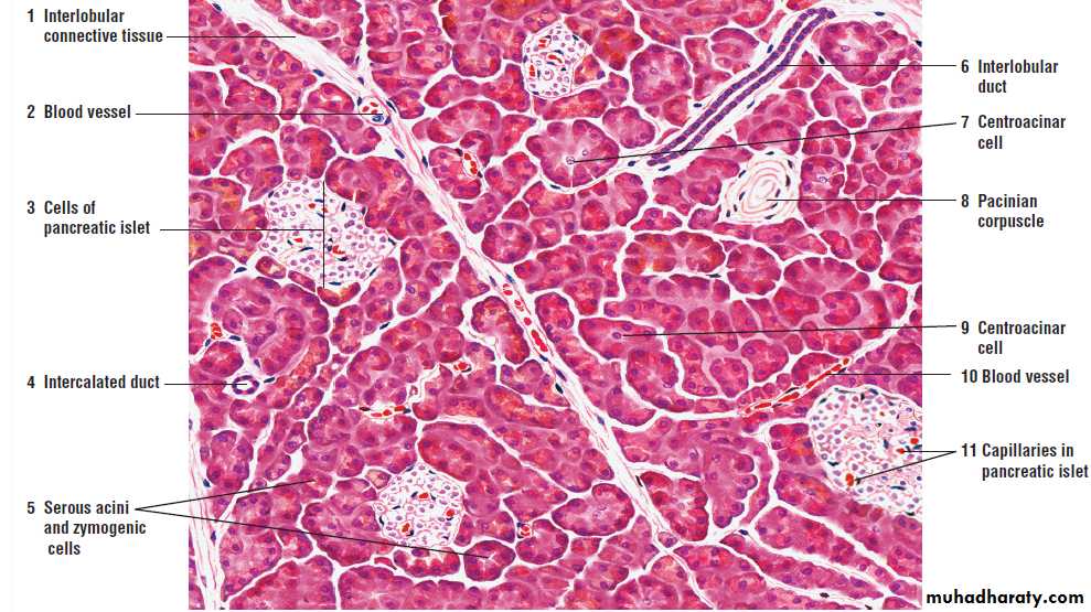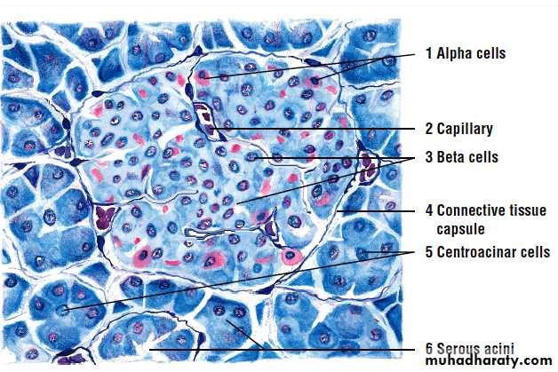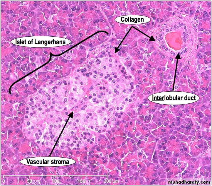 Th e endocrine units of the pancreas are scattered among the exocrine acini the cells are primarily smaller, similar to enteroendocrine cells & located in variously sized clusters as isolated, pale-staining, and highly vascularized units called pancreatic islets (of Langerhans).Each islet is surrounded by fine fi bers of the reticular connective tissue.