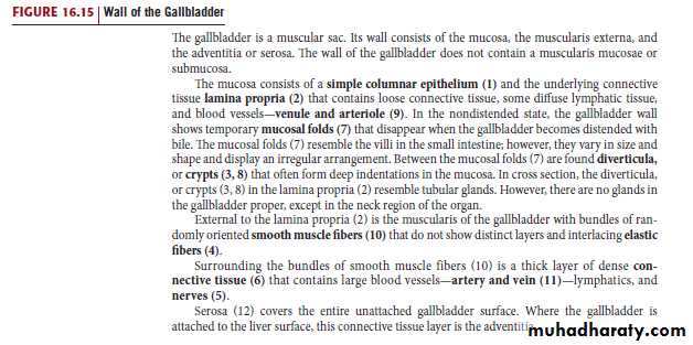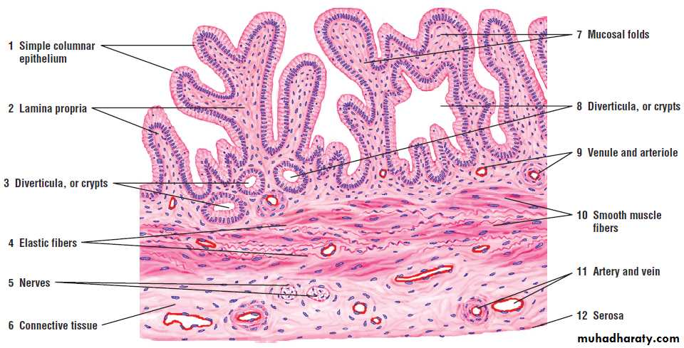 The mucosa consists of a simple columnar epithelium and the underlying connective tissue lamina propria contains loose connective tissue, some diffuse lymphatic tissue, and blood vessels—venule and arteriole.In the nondistended state, the gallbladder wall shows temporary mucosal folds that disappear when the gallbladder becomes distended with bile. The mucosal folds resemble the villi in the small intestine; however, they vary in size and shape and display an irregular arrangement. Between the mucosal folds are found diverticula, or crypts that often form deep indentations in the mucosa.