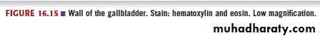 External to the lamina propria is the muscularis of the gallbladder with bundles of randomly oriented smooth muscle fibers that do not show distinct layers and interlacing elastic fibers.Surrounding the bundles of smooth muscle fibers is a thick layer of dense connective tissue that contains large blood vessels—artery and vein, lymphatics, and nerves.