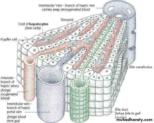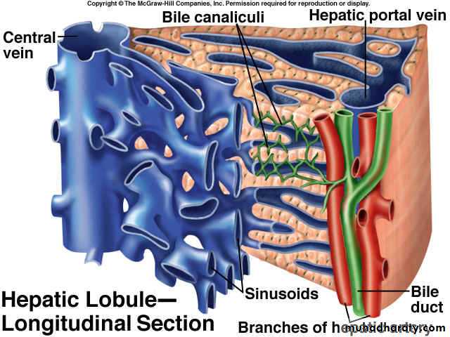 each liver lobe is seen to be made up of hepatic lobules. The lobules are roughly hexagonal, and consist of plates of hepatocytes radiating from a central vein which joins the hepatic vein and drain blood from liver.Portal traid consist of