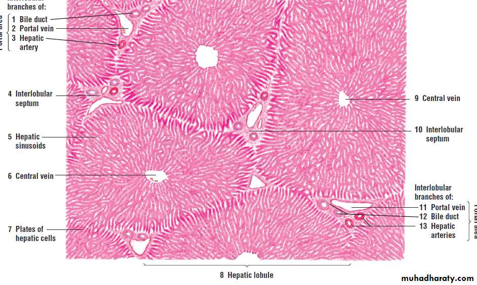 portal areas containing interlobular branches of the portal veins (2, 11), hepatic arteries (3, 13), and bile ducts (1, 12) are visible around the lobule (8) peripheries in the interlobular septa (4, 10).Th is fi gure illustrates numerous hepatic lobules (8). In the center of each hepatic lobule (8)