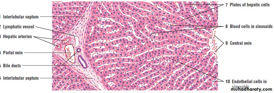 A section of the hepatic lobule between the central vein (9) and the peripheral connective tissue interlobular septum (1, 6) of the portal area is illustrated in greater detail. In the interlobular septum (1, 6) are transverse sections of a portal vein (4), hepatic arteries (3), bile ducts (5), and a lymphatic vessel (2). Multiple cross sections of hepatic arteries (3) and bile ducts (5) are attributable either to their branching in the septum or their passage into and out of the septum.Branches of the portal vein (4) and hepatic artery (3) penetrate the interlobular septum (1, 6)