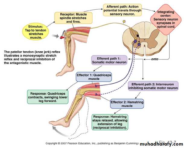 When activated inhibit motor neuron controlling antagonistic muscles (knee jerk – inhibition of knee flexor muscles).