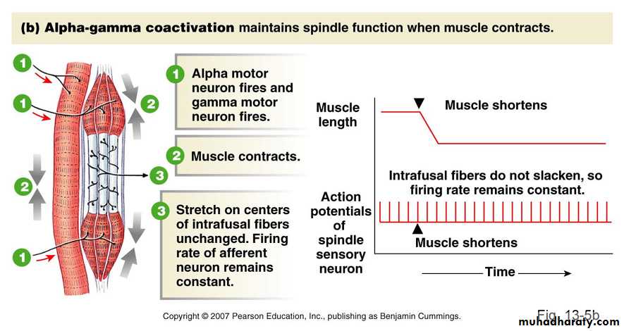 In contrast:Contraction of the extrafusal fibers muscle shortening remove tension on the spindle slow firing rate of stretch receptor.