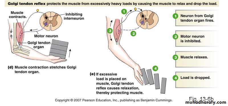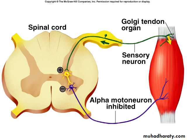 • Prevent muscle tearing or tendon avulsion from its attachments to the bone.• Equalize contractile forces of separate muscle fibers (fibers which exert excess tension become inhibited by the reflex spread muscle load over all fibers prevent damage in isolated areas of a muscle where small numbers of fibers might be overloaded